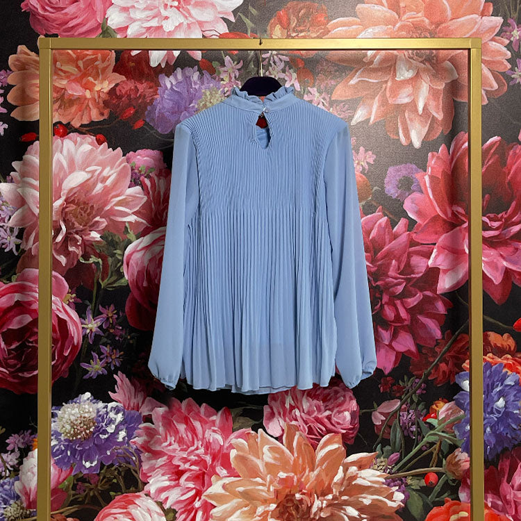 Plissierte Bluse in leichter A-Linie, unterfüttert, Rundhals - Stehbund gerüscht.