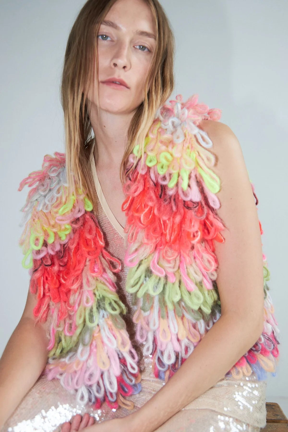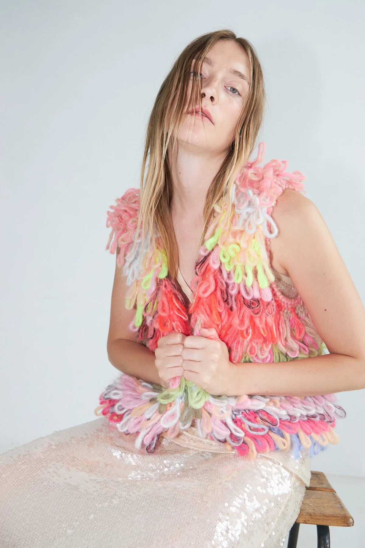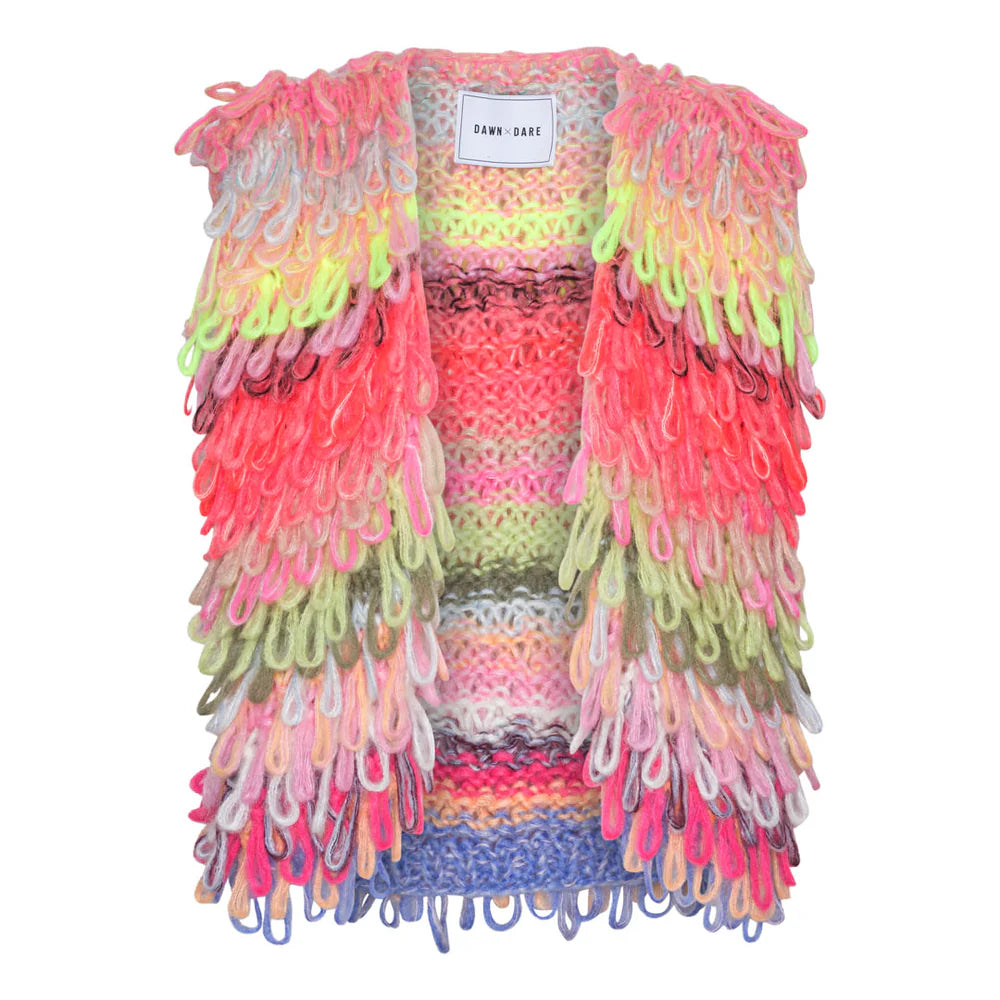 Unsere handgestrickte Dawn x Dare Fonda Bold Multi Weste besticht durch ihre lebendigen Farben und das lässige, coole Design. Große Schlaufen verleihen ihr eine verspielte Note und machen sie zum perfekten Begleiter für jeden Tag. Ein absolutes Must-Have für alle, die es bunt und unkonventionell mögen!