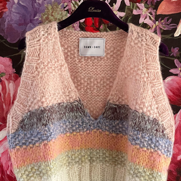 Erfrischend und lässig, unser Pullunder mit V-Ausschnitt. Bunte Streifen in Pastelfarben sorgen für einen verspielten Look. Mit Dawn x Dare's Ginny Pastel ziehst du alle Blicke auf dich.