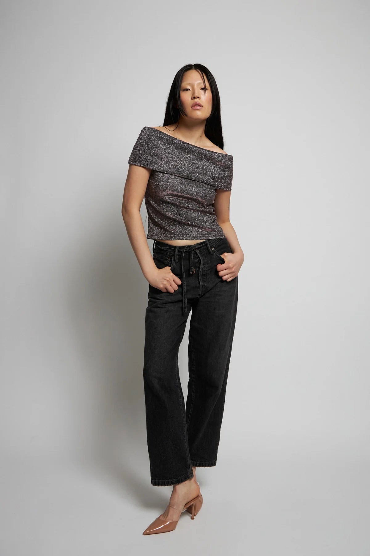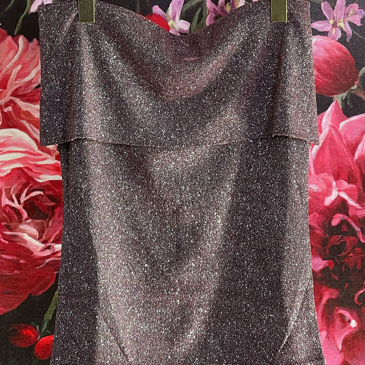 Megane ist ein schulterfreies Metallic-Top aus leichtem Stoff.