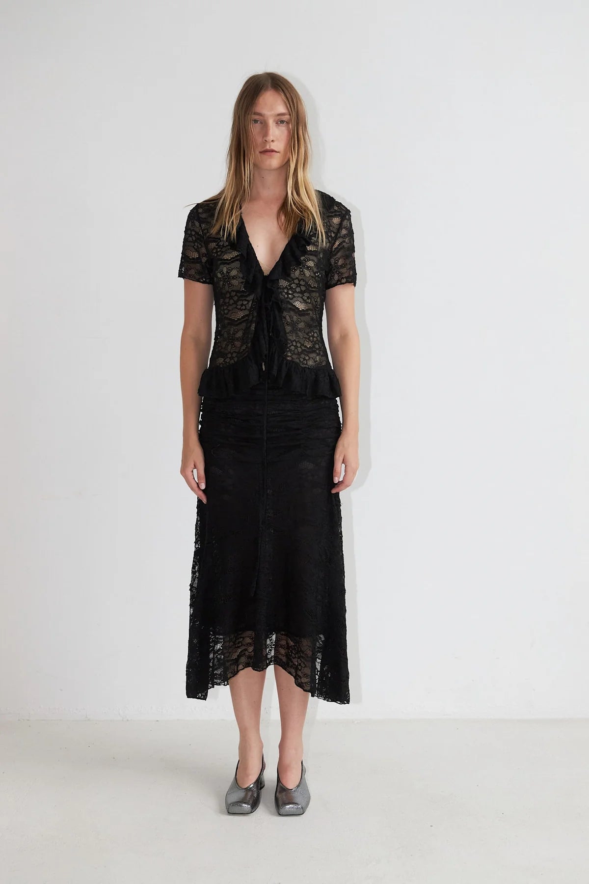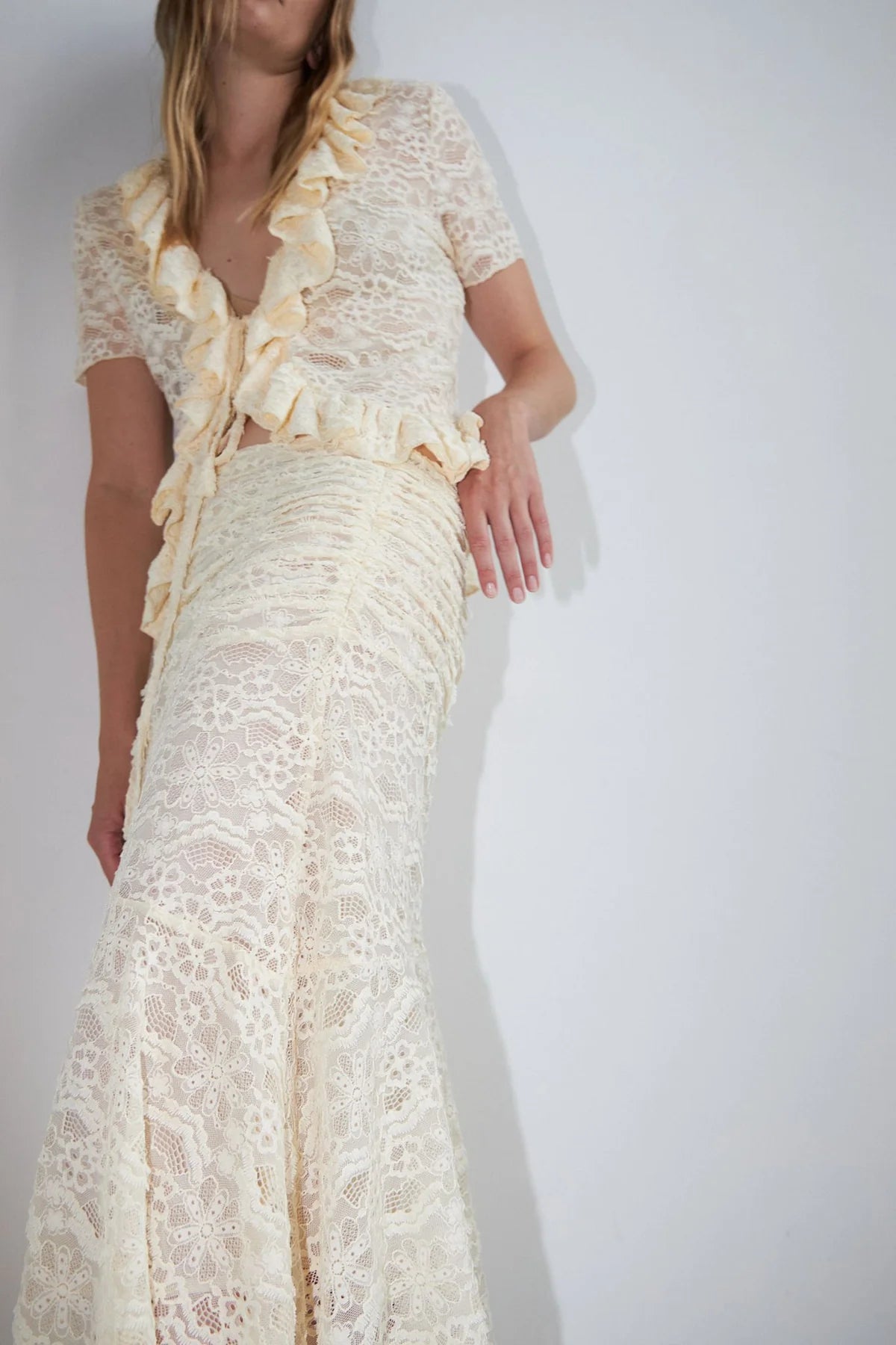 Erlebe den perfekten Mix aus Spitze und Top ( Jäckchen ) mit Dawn x Dare Top Gaynor! Kurzärmelig und flexibel zum Binden, mit süßen Rüschen am Saum. In 2 Farben erhältlich, für jeden Anlass der passende Begleiter.