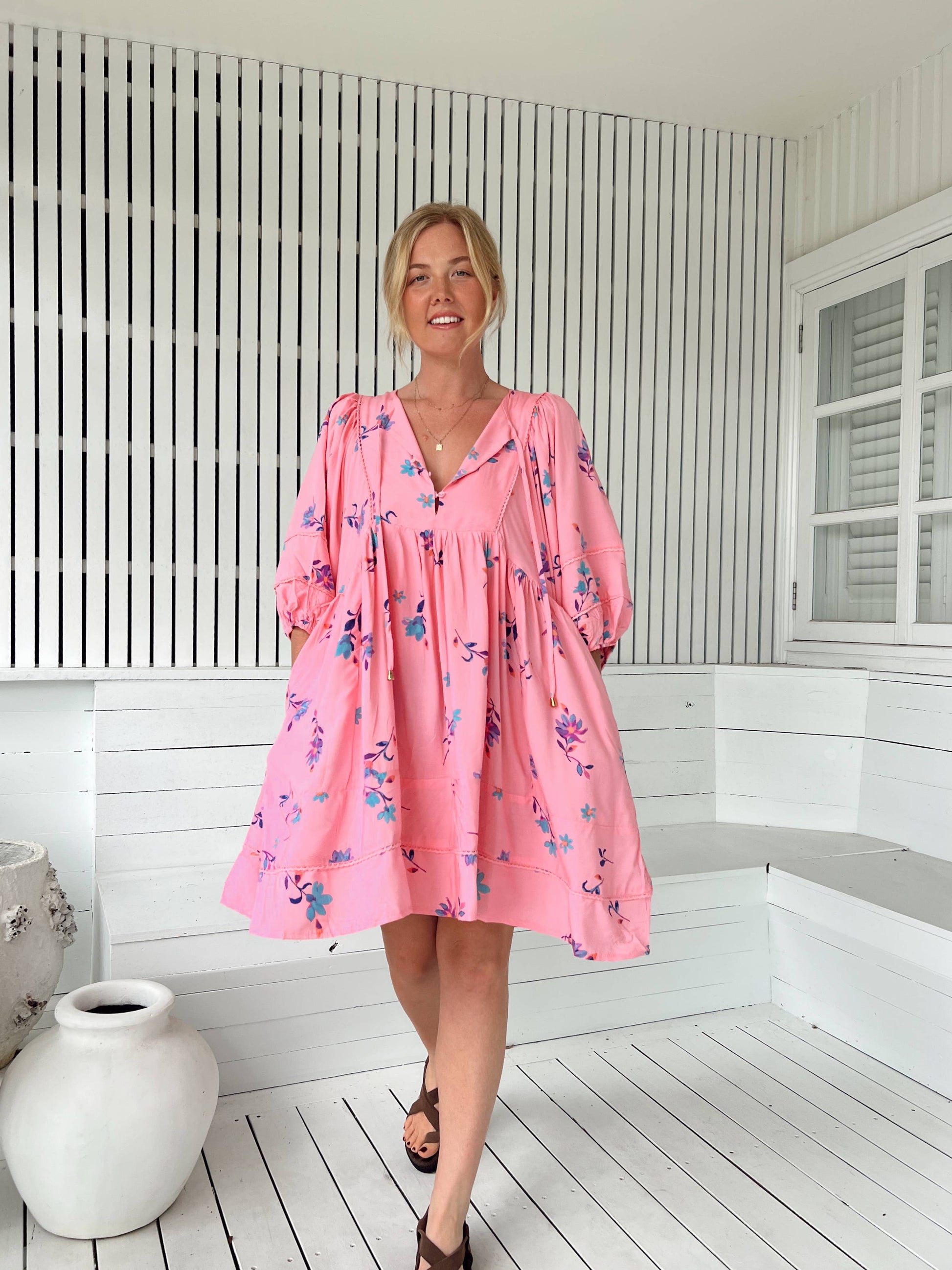 Das Kleid Sweet Kaddy mit fließender Silhouette besitzt einen Babydoll-Ausschnitt und praktische Taschen, die die Form betonen. Spitzendetails, Ballonärmel und die Mitte-oberschenkel Länge machen dieses Kleid zum idealen Begleiter für jede Gelegenheit. Aufgrund des großzügigen Schnitts empfehlen wir bei gewünschtem engerem Sitz eine kleinere Größe.