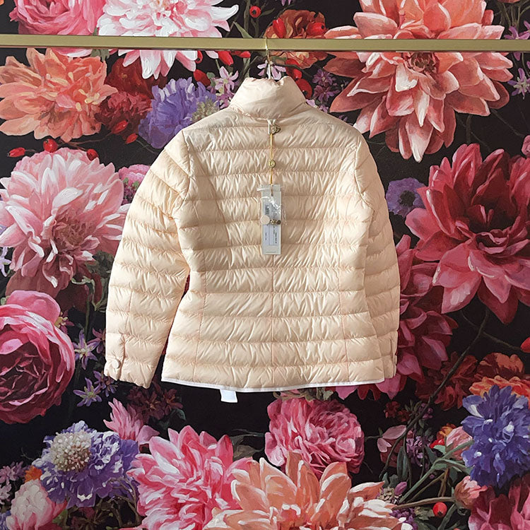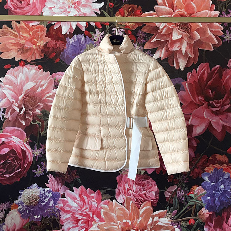 Daunenjacke von Martylo, federleicht und trotzdem wunderbar warm. Sommerdaunenjacke im Blazer-Design. 2-farbig, türkis außen, innen weiß, Taillienband weiß, die Jacke kann auch offen getragen werden.