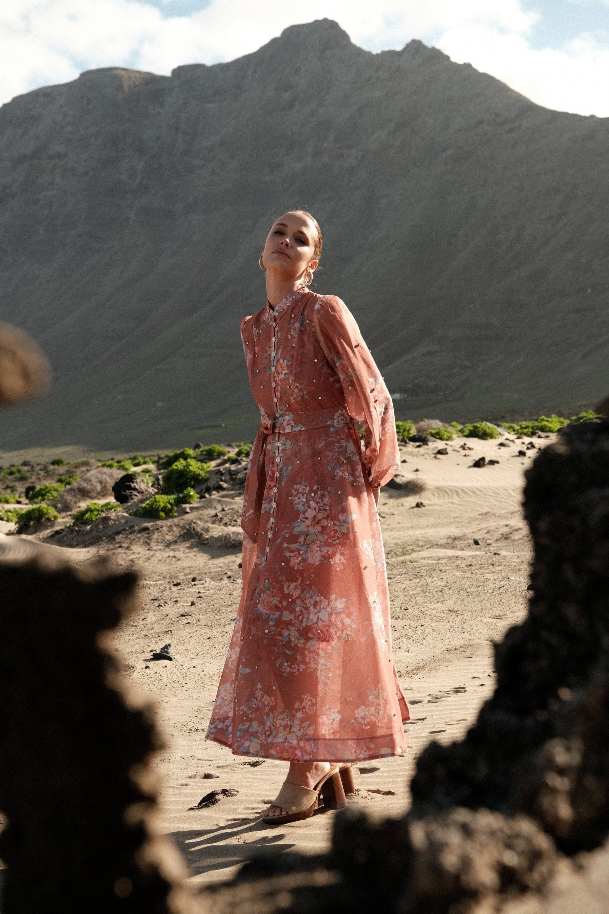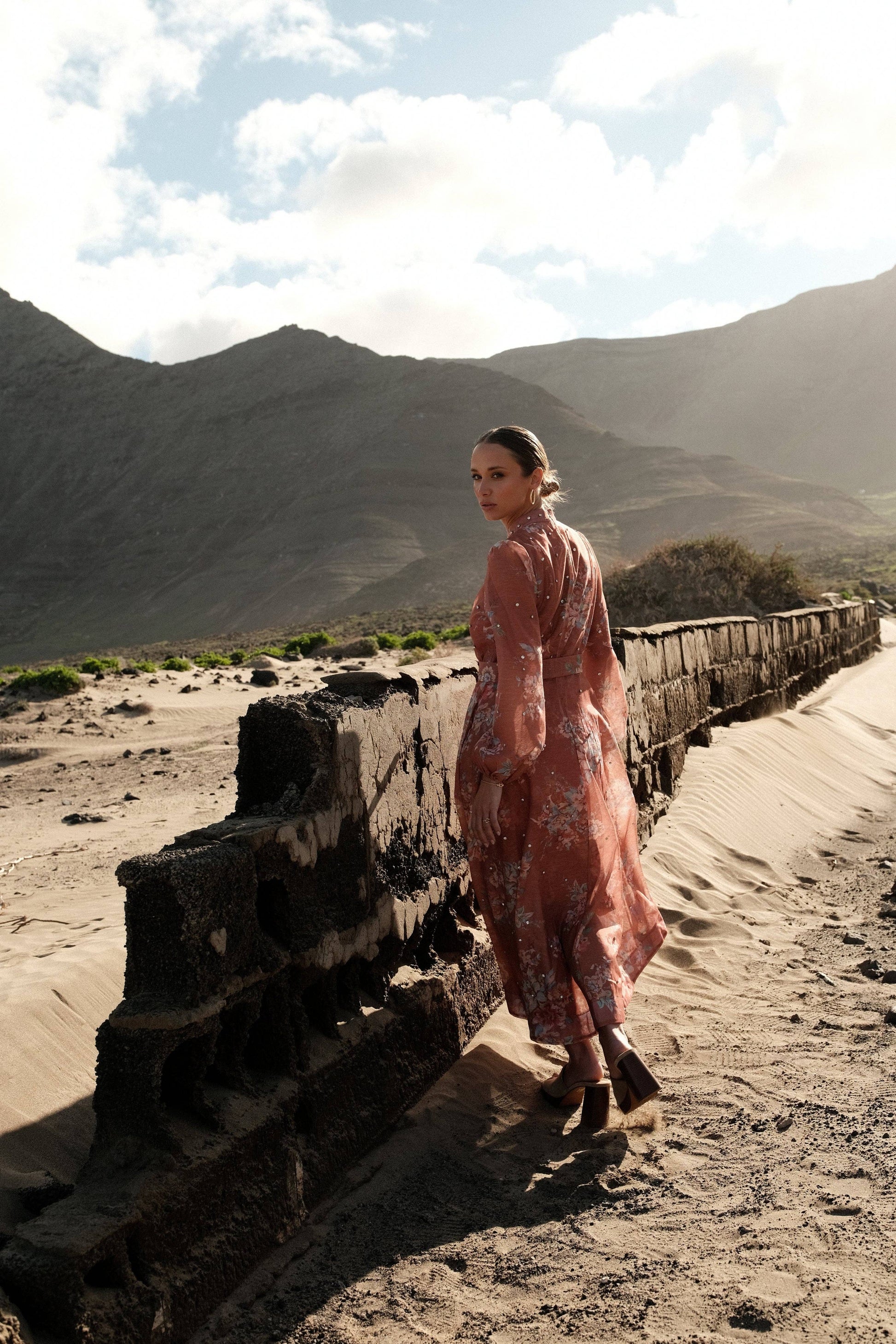 Das Noria-Kleid zeichnet sich durch seine lange, fließende Linie aus, die durch einen Ton-in-Ton-Gürtel betont wird. Der Blumenprint und der leicht transparente Schleier erzeugen bei jedem Schritt eine leichte Bewegung.