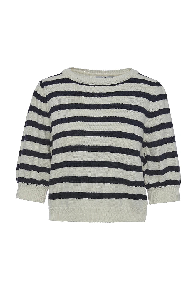 Klassischer gestreifter Strickpullover mit Rundhalsausschnitt und 3/4langen Puffärmeln. Das Modell besticht durch seinen regular fit, der eine bequeme Passform für den Alltag bietet. Die zeitlose Streifenkombination in Schwarz und Off-White macht diesen Pullover zu einem vielseitigen Basics-Piece, das sich mühelos zu verschiedenen Outfits kombinieren lässt. Perfekt für Übergangsjahreszeiten und layering.